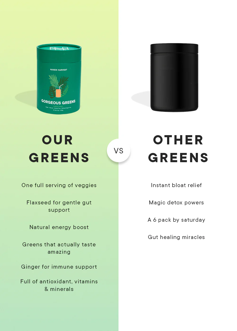INGREDIENTS: Greens Blend (63%) (Organic Spinach, Organic Wheat Grass, Organic Barley Grass, Organic Broccoli, Organic Kale, Alfalfa, Celery), Soluble Maize Fibre, Organic Flaxseed Fibre, Acidity Regulator (Citric Acid), Natural Flavour, Anticaking Agent (Silicon Dioxide), Ginger, Natural Sweeteners (Steviol Glycosides, Thaumatin).